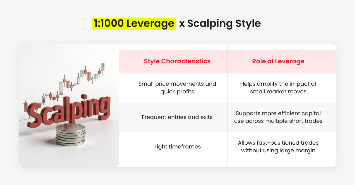 1:1000 leverage can help scalp traders control larger positions while committing less capital to each trade. Since scalping trading focuses on small price changes, this can make short market moves more impactful.
