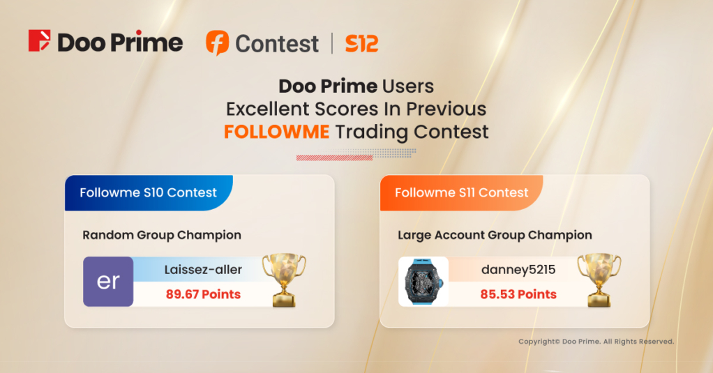 Time to test your best trading techniques with the top industry professionals; the opportunity of a lifetime awaits. The FOLLOWME S12 Trading Contest registration channel is now open, so sign up for a Doo Prime account and be in the running to win the contest with bonuses, rewards and so much more.