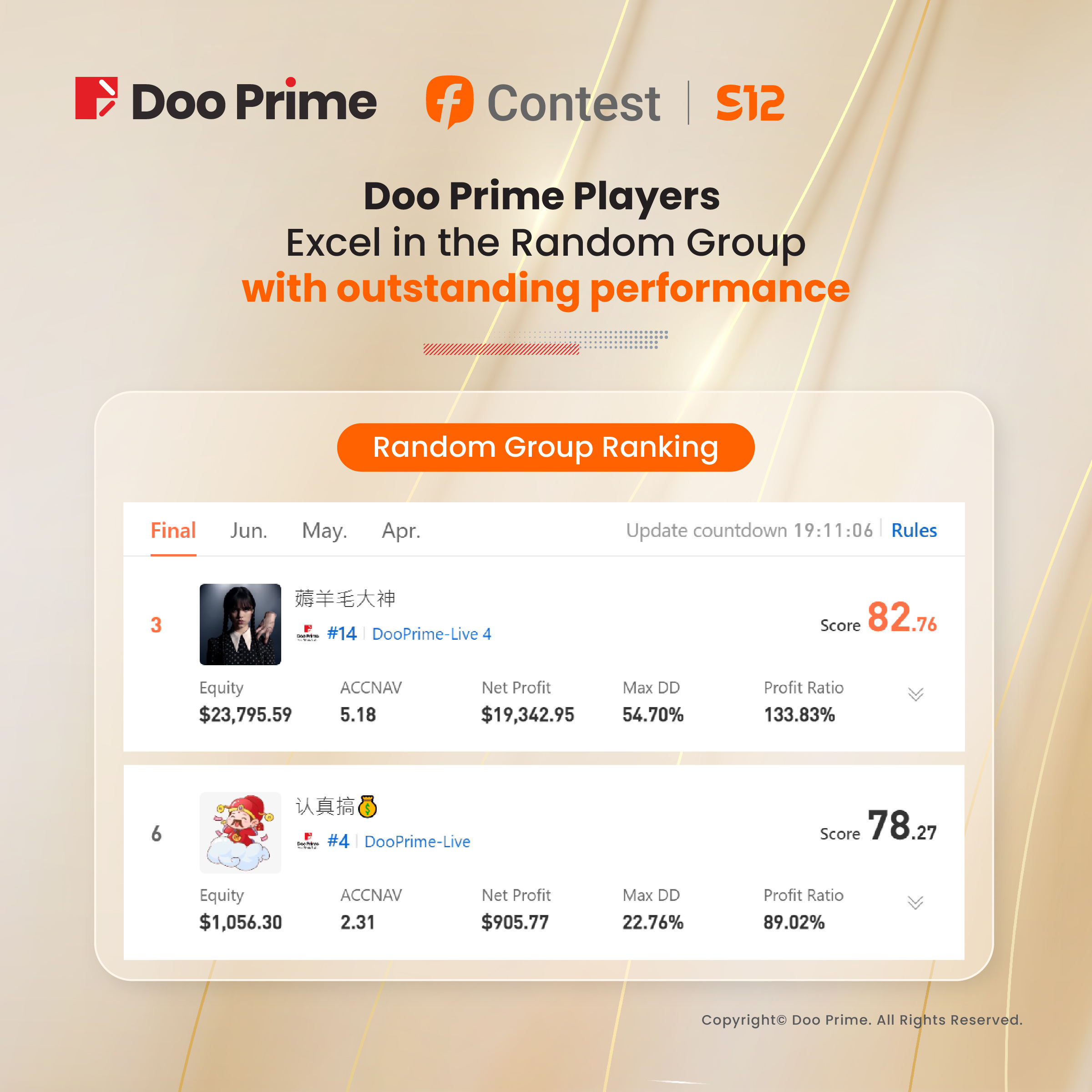 The FOLLOWME S12 trading competition concluded with great success, bringing together a diverse and highly skilled group of Doo Prime participants. With this event and collaboration, Doo Prime aimed to provide a platform for investors to share trading experiences and refine their techniques. As the proud diamond sponsor of the event, Doo Prime supported the participants throughout the three-month journey, witnessing impressive achievements and substantial gains.
