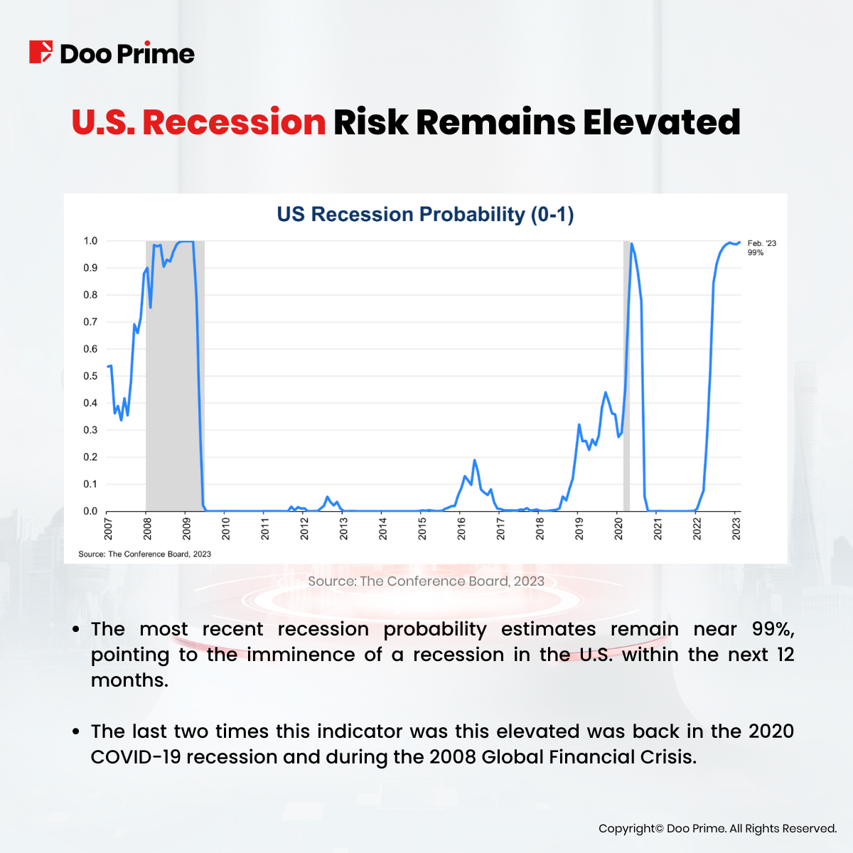 - The most recent recession probability estimates remain near 99%, pointing to the imminence of a recession in the U.S. within the next 12 months.