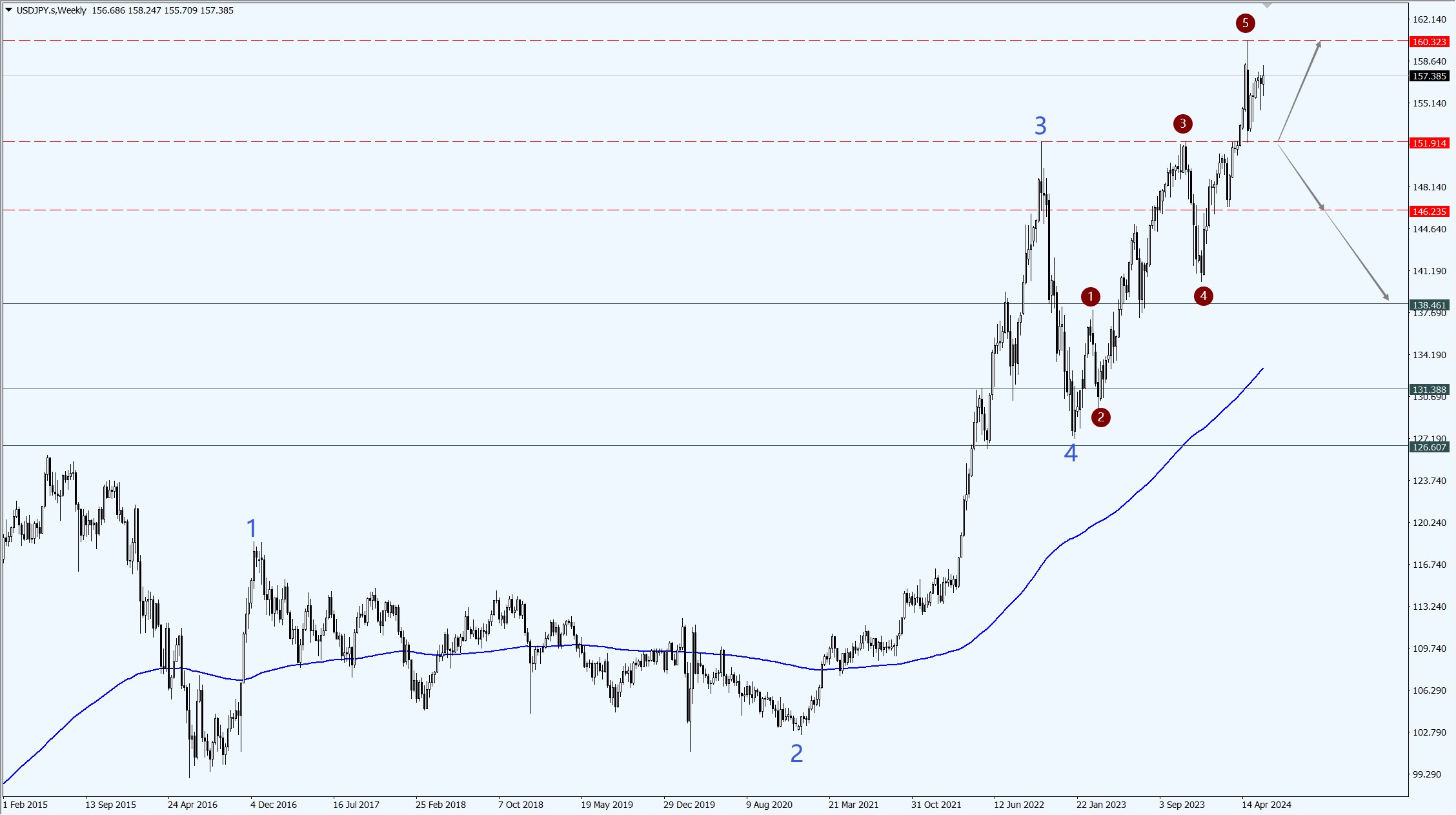 • 美元兑日元大级别的上升结构标注如图所示,目前处于阶段性转换期,因此如果下周美元兑日元稳定运行于 151.91 一线上方,则预示投机性买盘依旧不肯放手,届时,依旧存在测试 160 整数关口的可能性;
