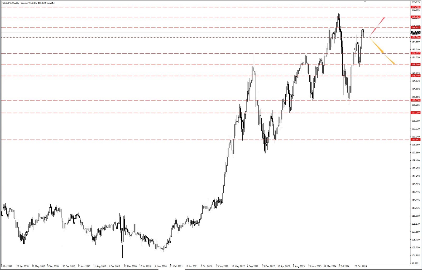 - 如果美元兑日元企稳于 156 一线附近,则依次关注 158.43 和 161.06 两个位置的压制力度;