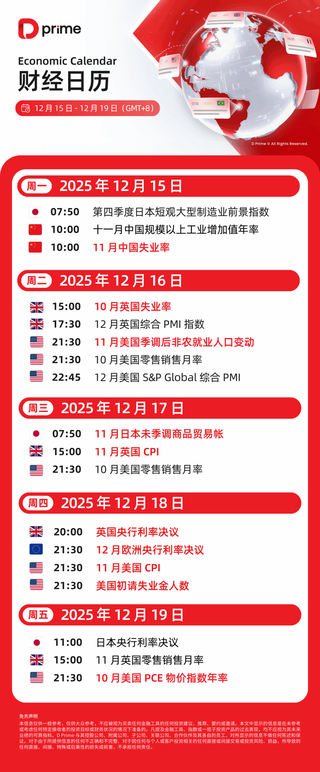 财经日历 | 以下为 2025 年 12 月 15 日至 2025 年 12 月 19 日(GMT+8 北京时间) 全球重大经济事件提醒。在重大行情期间,请确保您已审查您的保证金率,并有足够的保证金来支撑您的风险敞口。