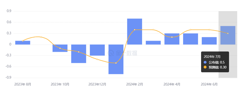 具体而言,7 月 CPI 同比上涨 0.5%;扣除食品和能源价格的核心 CPI 环比上涨 0.3%,高于近十年同期平均水平;同比上涨 0.4%,保持温和上涨。7 月 PPI 同比下降 0.8%,环比下降 0.2%,环比、同比降幅均与上月相同。