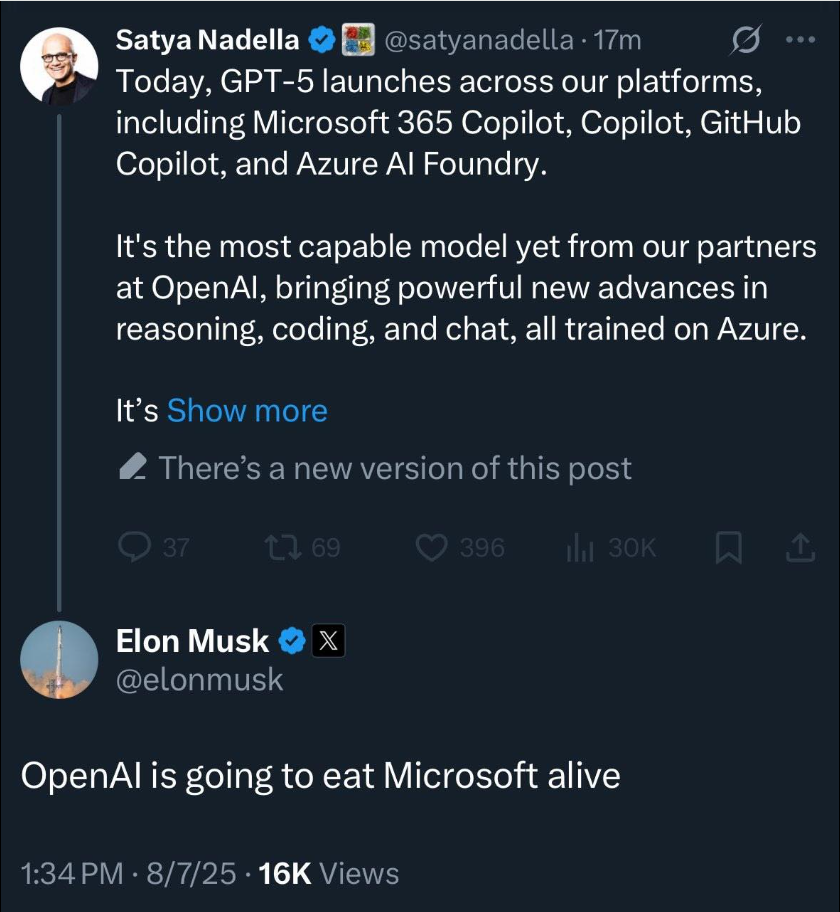 微软首席执行官萨提亚·纳德拉在 GPT-5 模型发布后宣布:“今天,GPT-5 已在我们的多个平台上线,包括 Microsoft 365 Copilot、Copilot、GitHub Copilot 和 Azure AI Foundry。这是我们合作伙伴 OpenAI 迄今为止最强大的模型,在推理、编码和对话方面实现了重要突破,所有训练均在Azure平台完成。”
