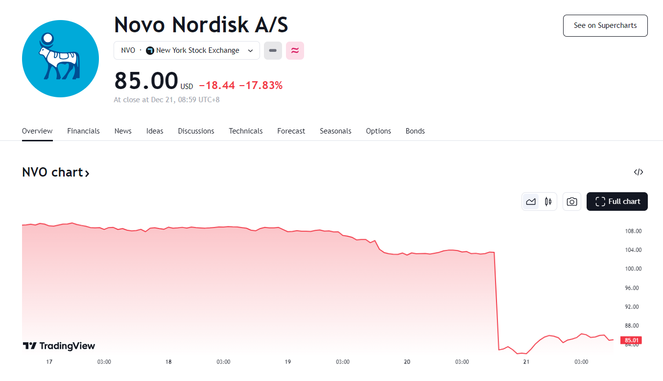 12 月 20 日,由于新减肥药 CagriSema 临床试验效果不及预期,诺和诺德美股盘前暴跌 27%,创下史上最大跌幅,市值瞬间蒸发了约 1200 亿美元。
