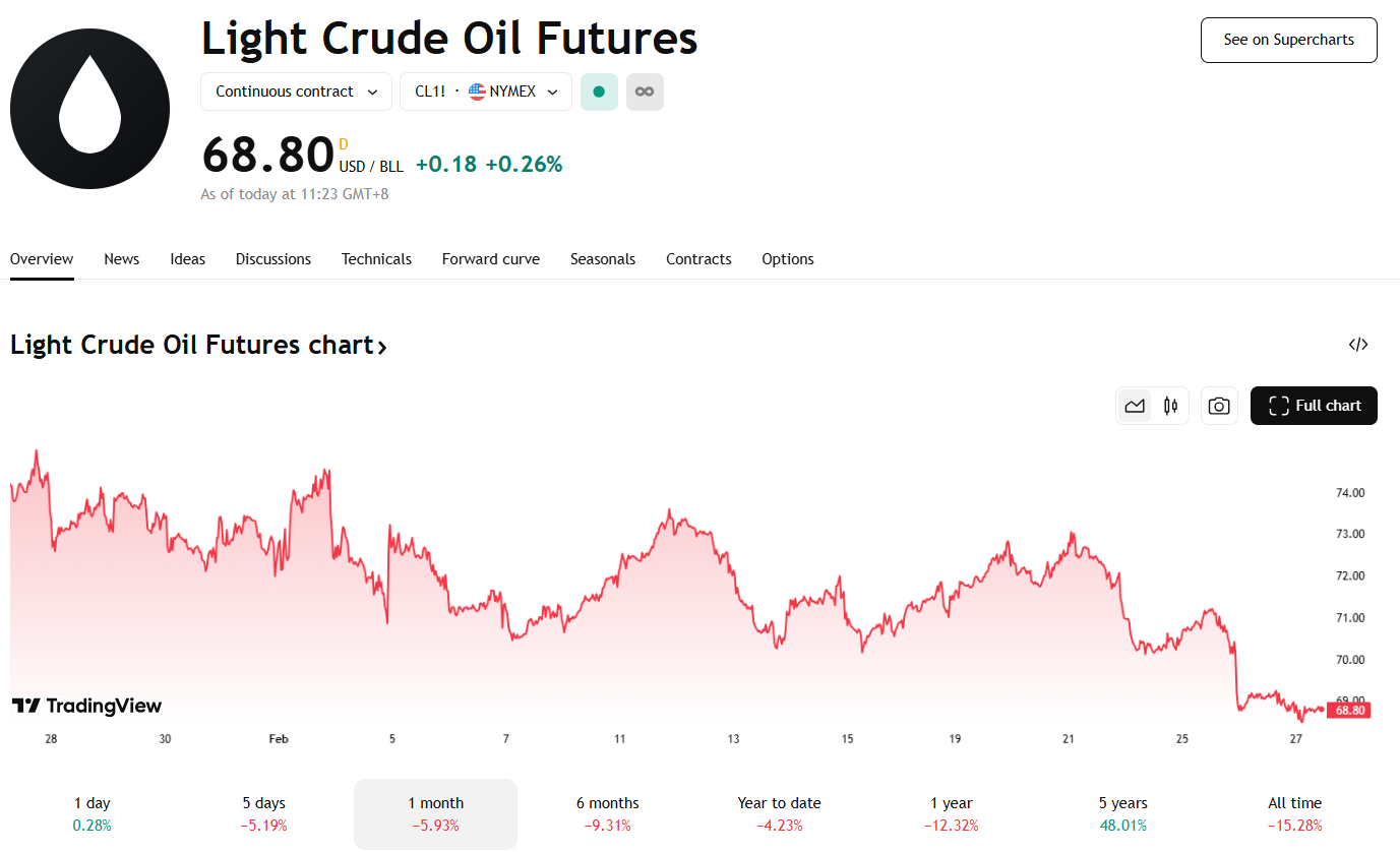 美国与贸易伙伴的紧张关系加剧,引发市场对经济前景的忧虑,掩盖了 OPEC+ 延后增产与对伊朗制裁可能推高油价的影响。这导致国际油价稳定在今年最低收盘价附近,西德州原油跌破 69 美元,布兰特原油则收于 72 美元以上。特朗普强调对墨西哥、加拿大的关税计划“不会停止”,并考虑对欧盟加征关税,市场普遍关注这些贸易举措对油价的影响,以及美国是否会进一步加强对伊朗的制裁。