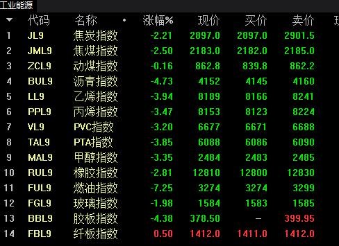 在中国商品期货市场,截止昨夜夜盘收盘,国内期货主力合约几乎全部下跌。燃料油跌超 7%,低硫燃料油(LU)跌近 6%,菜籽油、棕榈油跌超 5%,沥青、液化石油气(LPG)、塑料、乙二醇(EG)跌超 4%,豆油跌近 4%。