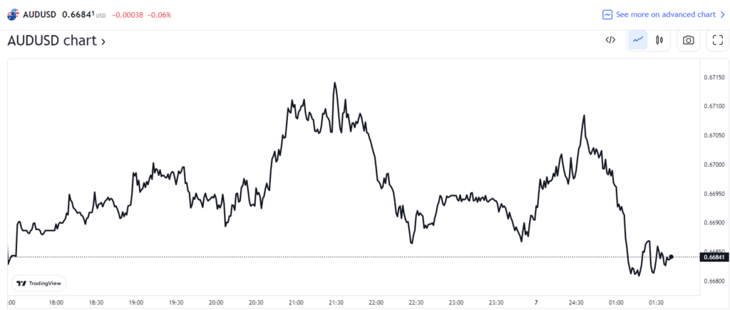 消息公布后,澳元兑美元短线走高后下挫,现报 0.6684。澳债收益率集体走高,1 年期澳债收益率上升 9 基点至 3.102%。
