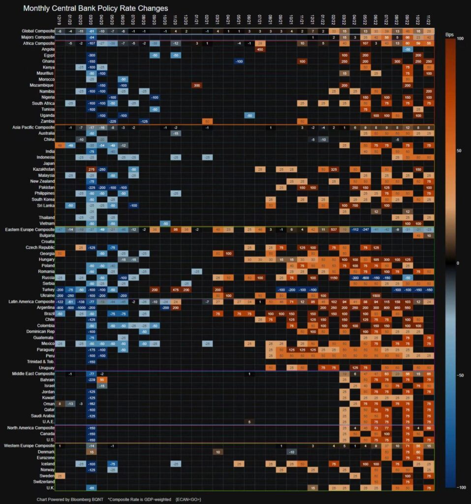 2019 年 12 月至 2022 年 11 月全球央行的政策利率变动的情况: