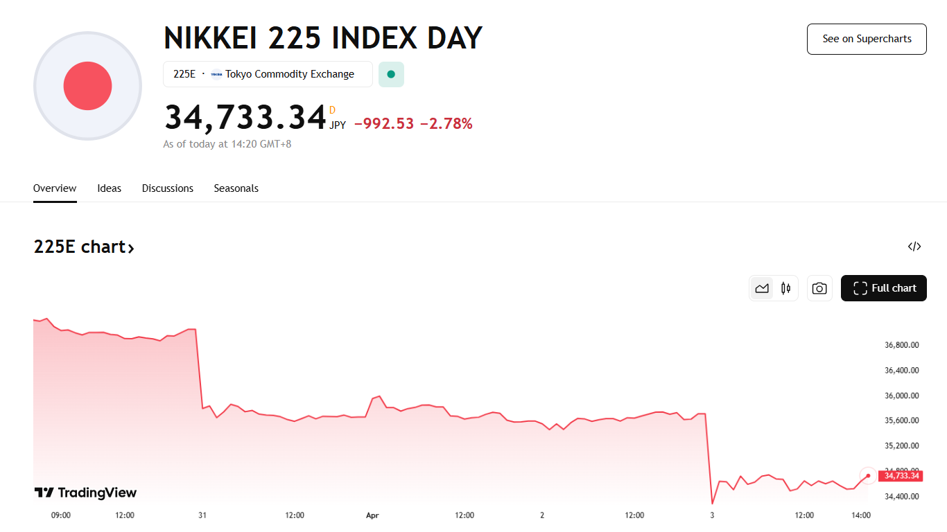 4 月 3 日,关税落地后亚太主要股指普跌,日经 225 指数重挫 4%,跌破 35,000 点,日本东证指数跌 3%;韩国 KOSPI 指数跌超 1.5%,MSCI 亚太指数下跌 1.3%。