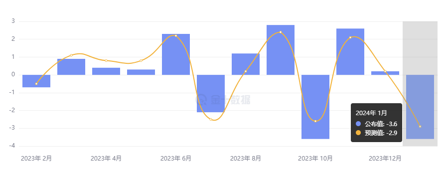欧盟统计局公布 1 月生产者价格指数(PPI)报告。受能源价格继续下滑的影响,1 月 PPI 同比下降 8.6%,降幅大于预期的下滑 8.1%,虽然降幅较前值下跌 10.6% 有所放缓,但已连续第九个月下滑。1 月 PPI 环比加速下滑至 -0.9%,远超预期的 -0.1%,为 2023 年 5 月以来的最大降幅。