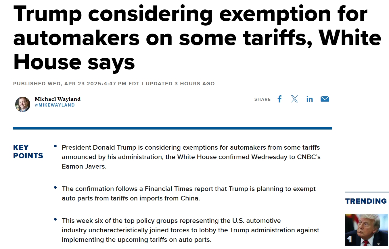行业动态 | 白宫称特朗普考虑豁免部分汽车关税,美联储褐皮书 “关税焦虑” 爆表