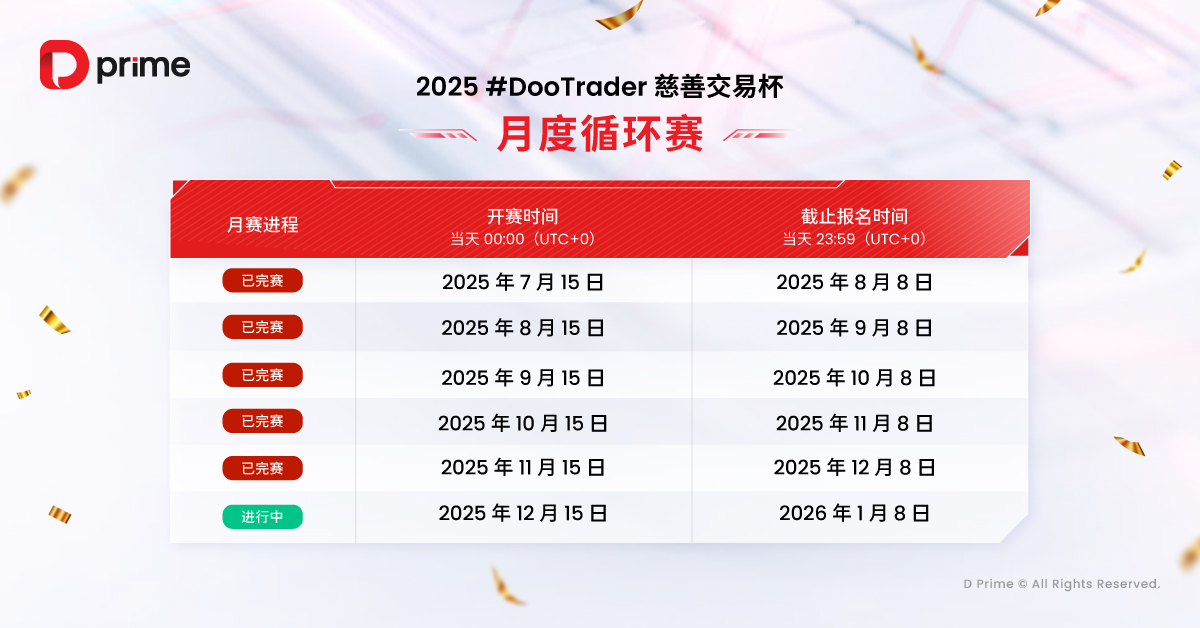 2025 年 D Prime #DooTrader 慈善交易杯第五轮月赛已于 12 月 14 日 23:59(UTC+0)顺利收官,赛果榜单火热揭晓!第六轮月赛紧随于 2025 年 12 月 15 日 00:00(UTC+0)开赛 —— 欢迎各路交易高手立刻报名,争夺最后轮月赛破浪组 TOP5 晋级线下岛屿争霸赛名额!