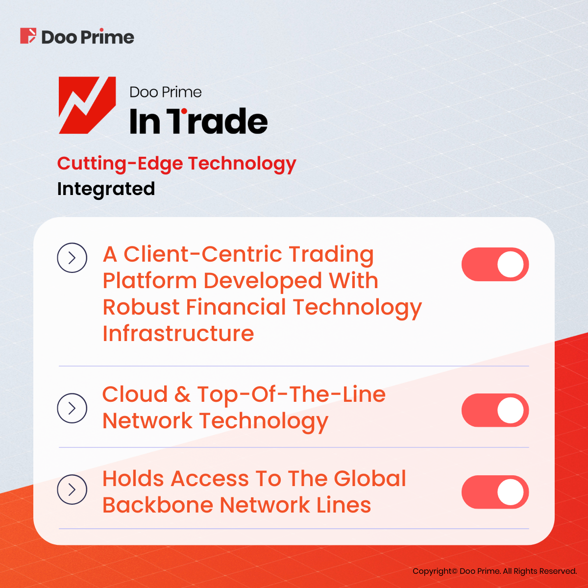 Doo Prime InTrade is developed a robust financial technology infrastructure. On this ground, the trading platform and mobile app are equipped with cloud and top-of-the-line network technology backed by a number of cutting-edge technologies. At the same time, the trading platform holds access to the global backbone network lines, providing users with a stable trading environment that traders can place reliance on.