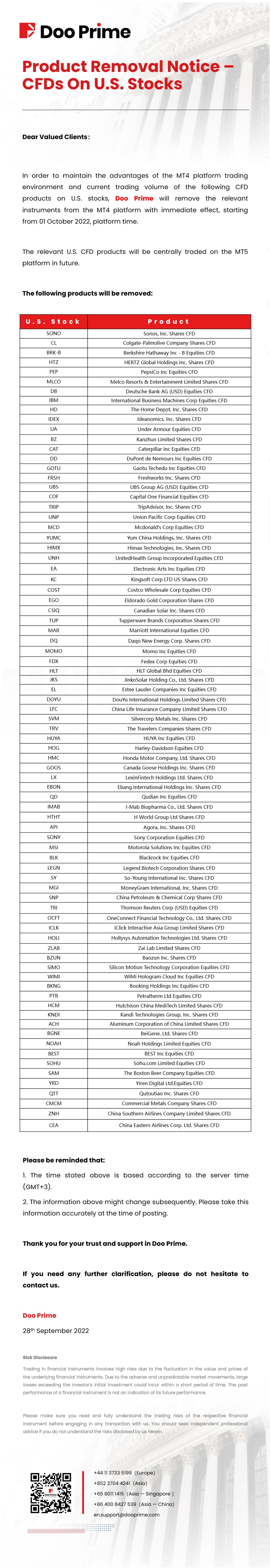 2022-09-28 | CFDs , Product Removal Notice , US Stocks