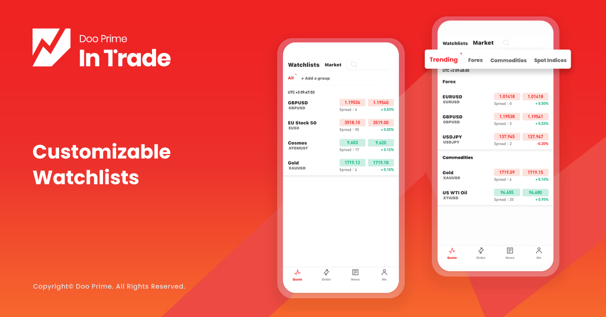 In the Doo Prime InTrade app, users can access and trade up to 10,000 CFD products from 6 major markets. From this, Doo Prime InTrade app users get to fulfill all their trading needs. All live quotes for each trading product are included on the first-page display. Hence, users get a quick overview of all their favorite trading products at a glance.