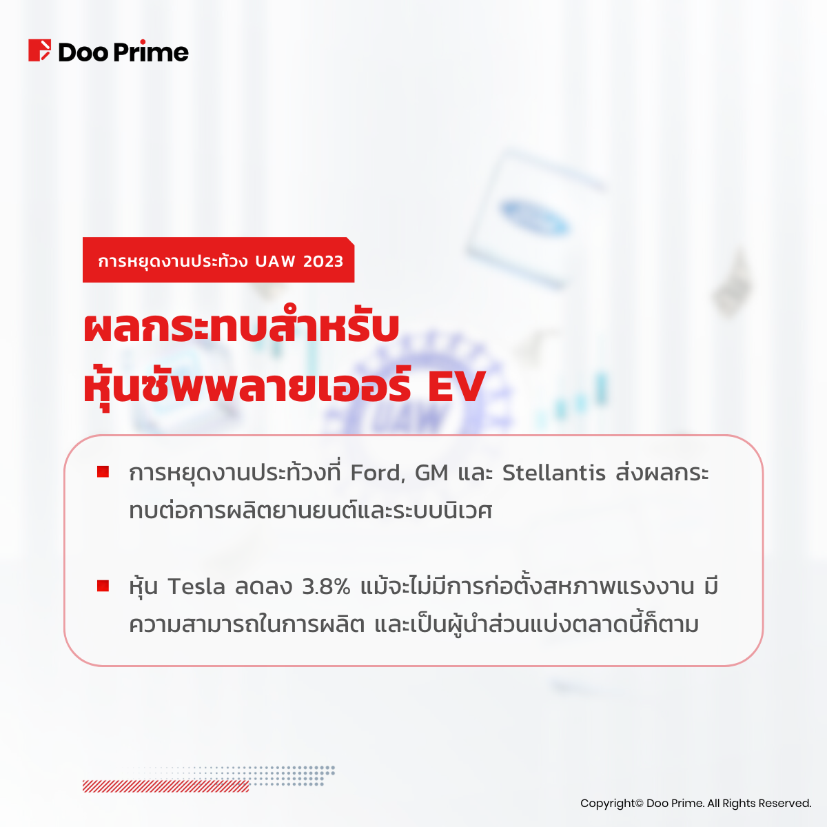 ราคาหุ้นมักสะท้อนถึงความรู้สึกของนักลงทุนและความเชื่อมั่นของตลาด หลังจากการนัดหยุดงาน หุ้นของ Ford, GM และ Stellantis ปรับตัวลดลงในช่วงแรกประมาณ 5-7% นักลงทุนมีความกังวลเกี่ยวกับปัจจัยอยู่หลายประการ: