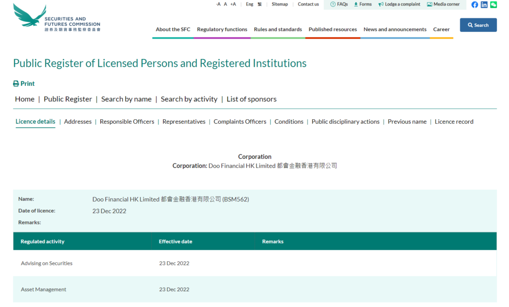 Công ty trực thuộc của Tập đoàn Doo Group – Doo Financial HK Limited (Mã số trung tâm thương hiệu: BSM562), vừa đánh dấu một cột mốc quan trọng khi chính thức được cấp Giấy phép Loại 4 (Tư Vấn Chứng Khoán) và Loại 9 (Quản Lý Tài Sản) bởi Ủy Ban Chứng Khoán Và Hợp Đồng Tương Lai Hồng Kông (HK SFC).