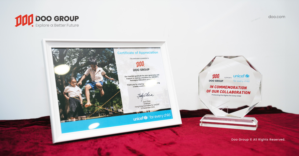 Doo Group xin hân hoan thông báo: Vào ngày 19 tháng 9 năm 2023, chúng tôi đã ký kết thành công một thoả thuận hợp tác với UNICEF HK. Như vậy, trong vòng 3 năm tới, Doo Group sẽ tiếp tục tham gia chương trình “Reimagine Education” (Đổi Mới Giáo Dục) của UNICEF. Cụ thể, chúng tôi sẽ tiếp tục đồng hành và hỗ trợ học tập thông qua việc mang đến cơ hội giáo dục số cho trẻ em và thanh thiếu niên có hoàn cảnh khó khăn, từ đó, khai phá được tối đa tiềm năng của đối tượng này.