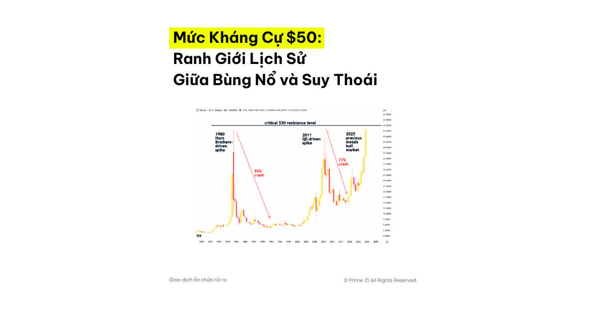 Mô hình trên đã thể hiện hành trình đầy “gian nan” của bạc: xây dựng một nền tảng lớn, thử thách với mốc 50 USD, rồi hoặc lao dốc, hoặc là tiếp tục phá vỡ và bước vào một kỷ nguyên mới.