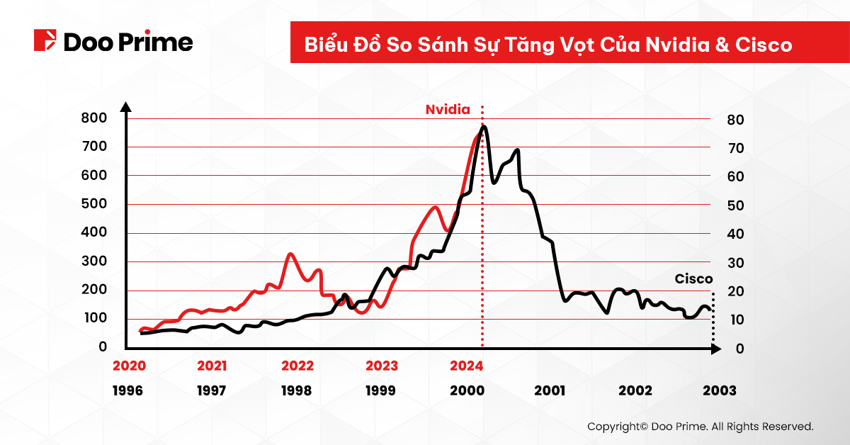 Để có thể phân tích những rủi ro và tiềm năng của đà tăng này, việc so sánh sự tương đồng của nó với các mẫu hình trong lịch sử là rất quan trọng. Nhằm đóng vai trò là một lời cảnh báo, chúng ta nên so sánh quỹ đạo của Cisco trong thời kỳ bong bóng dot-com năm 2000 với Nvidia ở thời điểm hiện tại. Giống như Nvidia, Cisco đã có những sự tăng trưởng đáng kể nhưng lại “đáp đất” ngay sau đó. Những phân tích sau đấy sẽ giúp nhà đầu tư đối chiếu, từ đó cho ra các quyết định đầu tư cẩn trọng và đúng đắn hơn.