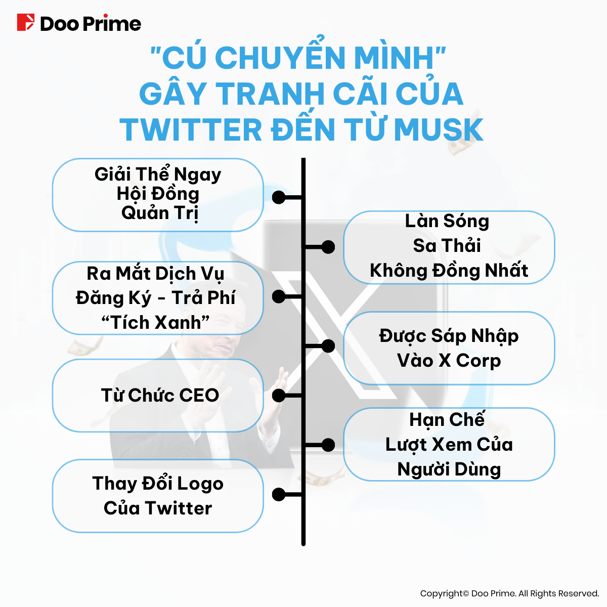 Từ sau khi mua lại Twitter, Musk đã sa thải các nhà điều hành, cắt giảm nhân sự trên quy mô lớn, bên cạnh việc giới thiệu những chính sách mới nhằm tăng doanh thu và chuyển đổi hệ sinh thái của nền tảng. Tuy nhiên, kết quả nhận được lại không như kỳ vọng, và những động thái trên liên tục khiến công chúng đặt ra nhiều nghi vấn. Nói đi cũng phải nói lại, những quyết định thoạt nhìn như ngẫu nhiên của Musk dường như đã được lên kế hoạch tỉ mỉ để “lót đường” cho sự ra mắt của siêu ứng dụng trên toàn cầu – “X”.