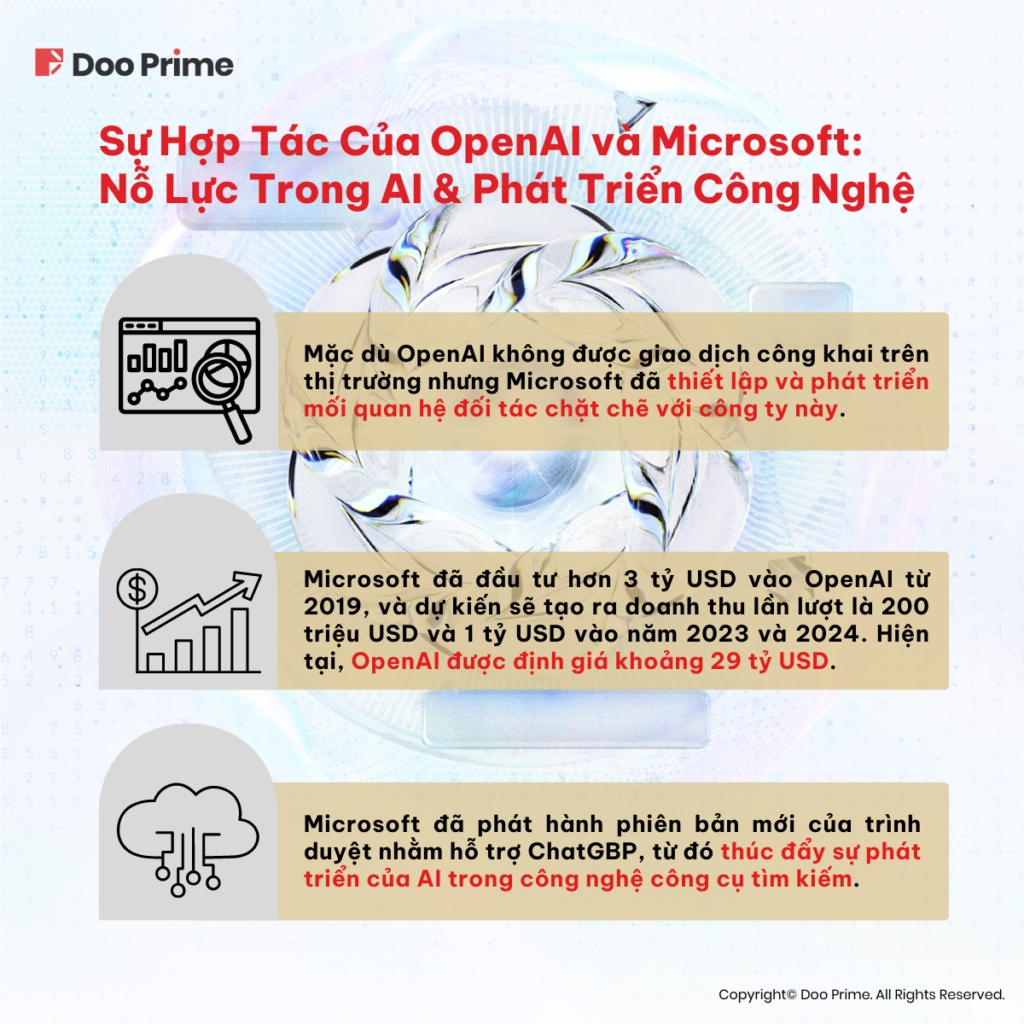 Mặc dù OpenAI không được giao dịch công khai trên thị trường nhưng Microsoft đã thiết lập và phát triển mối quan hệ đối tác chặt chẽ với công ty này. Cụ thể, phía Microsoft đã đầu tư ít nhất 3 tỷ USD kể từ năm 2019, và thậm chí còn đang ấp ủ kế hoạch đầu tư mạnh tay hơn nữa trong tương lai. Theo dự kiến, OpenAI sẽ tạo ra doanh thu rơi vào khoảng 200 triệu USD vào năm 2023 và 1 tỷ USD vào năm 2024. Riêng đối với thời điểm hiện tại, OpenAI đang được định giá khoảng 29 tỷ USD.