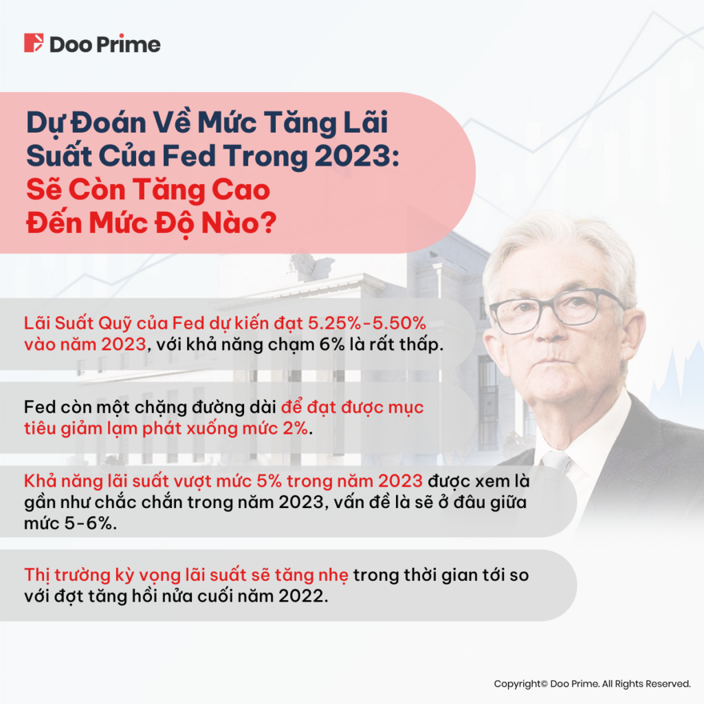Thể theo kỳ vọng của thị trường hiện tại, Lãi Suất Quỹ của Fed có khả năng đạt trong ngưỡng từ 5.25% đến 5.50% vào năm 2023. Một số ít thì cho rằng lãi suất có thể chạm mốc 6%, tuy nhiên khả năng này có thể xảy ra là rất thấp.