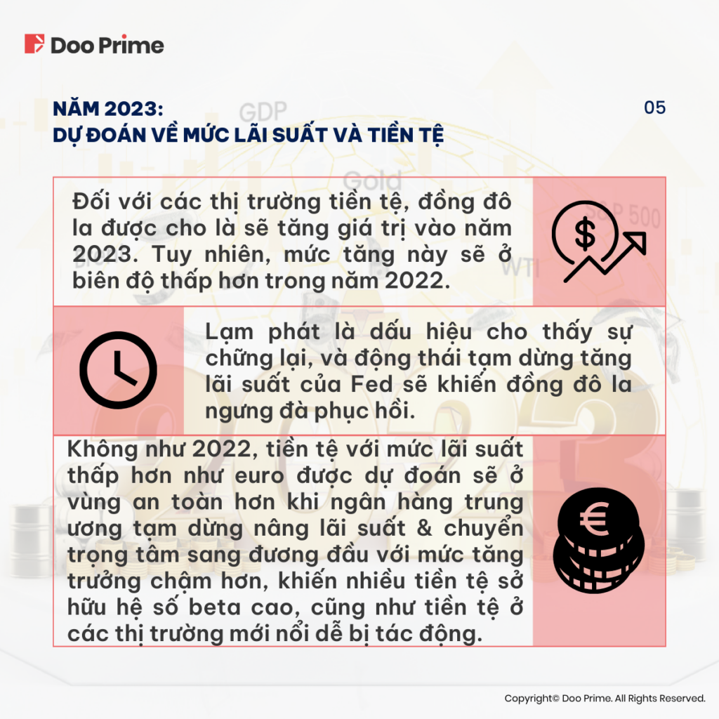 Riêng đối với các thị trường tiền tệ, đồng đô la được cho là sẽ tăng giá trị vào năm 2023. Tuy nhiên, mức tăng này sẽ ở biên độ thấp hơn trong năm 2022.