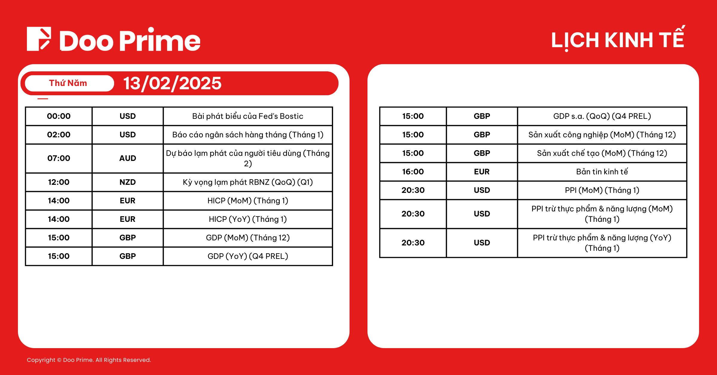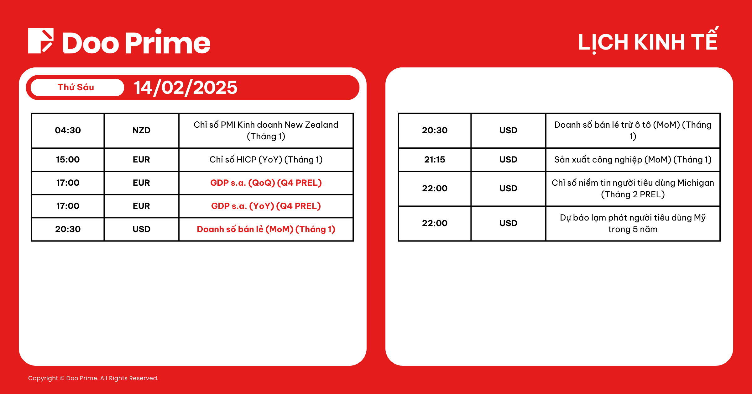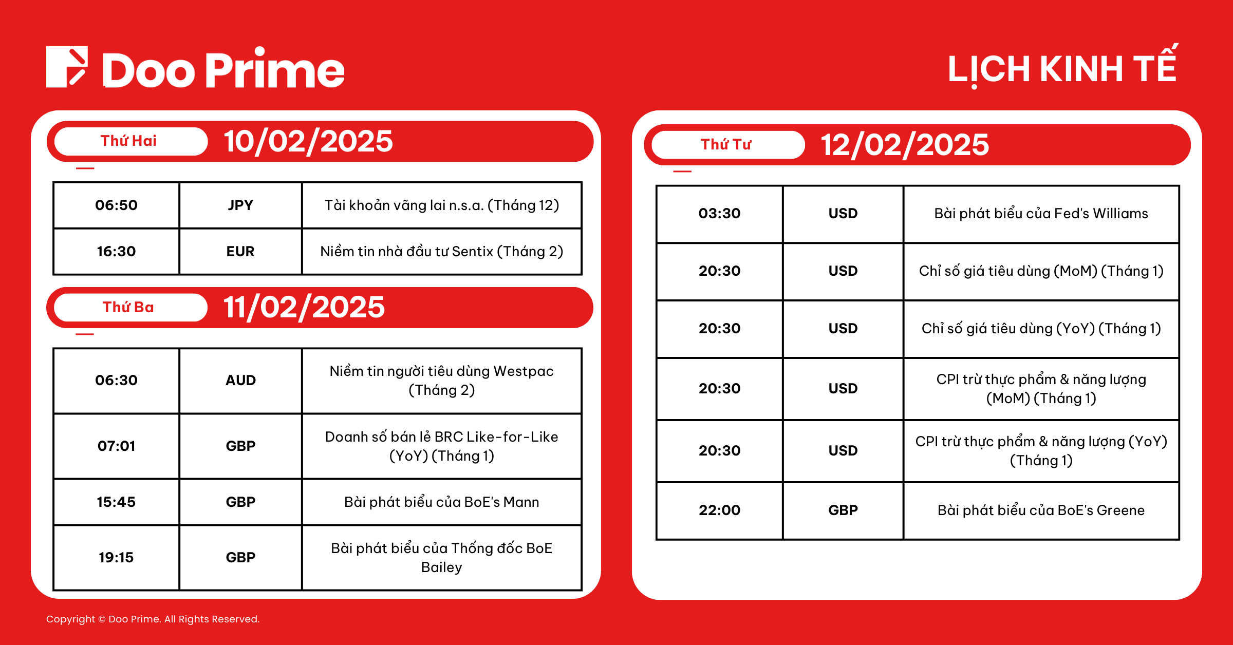 Tuần giữa tháng 2 hứa hẹn mang đến loạt sự kiện kinh tế đáng chú ý, bao gồm các chỉ số niềm tin tiêu dùng, doanh số bán lẻ, báo cáo GDP và các phát biểu từ các ngân hàng trung ương. Đây là thời điểm các nhà giao dịch và nhà đầu tư cần chuẩn bị kỹ lưỡng để tận dụng cơ hội và đối phó với các biến động bất ngờ của thị trường.